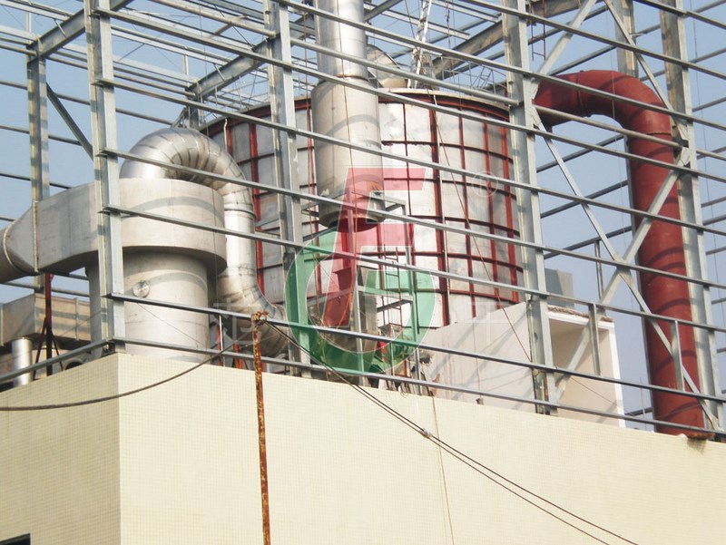 1.塔徑塔高作了相應的調整,既保證粉料干燥之前達不到塔壁,又可保證粉料的熱風停留時間而完成低溫干燥;塔壁設有夾套冷風冷卻裝置,確保料液不會粘結在塔壁上因局部溫度過高而產生軟化、熔融甚至焦化現象;錐度增大,錐體上安裝空氣震擊器,用壓縮空氣脈沖式地震擊筒體,把吸附在筒體上的粉料順暢地擊落下來。