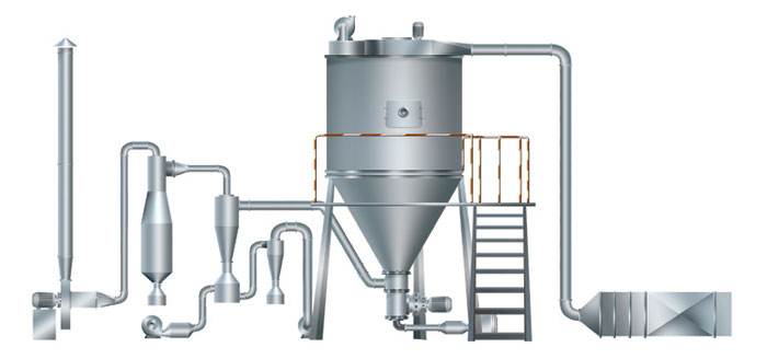 空氣經(jīng)過濾和加熱,進(jìn)入干燥器頂部空氣分配器,熱空氣呈螺旋狀均勻地進(jìn)入干燥室。料液經(jīng)塔體頂部的高速離心霧化器,(旋轉(zhuǎn))噴霧成極細(xì)微的霧狀液珠,與熱空氣并流接觸在極短的時間內(nèi)可干燥為成品。成品連續(xù)地由干燥塔底部和旋風(fēng)分離器中輸出,廢氣由風(fēng)機(jī)排空。