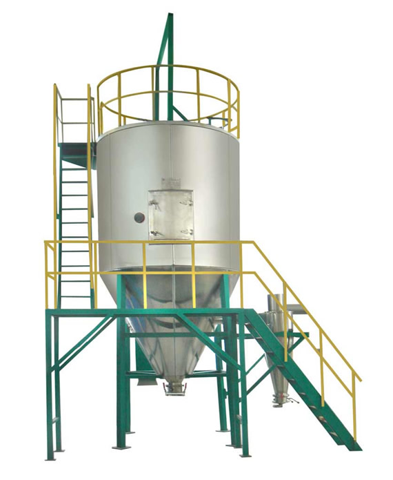 空氣經過過濾和加熱,進入干燥器頂部空氣分配器,熱空氣呈螺旋狀均勻地進入干燥室。料液經塔體頂部的高速離心霧化器(旋轉)噴霧成極細微的霧狀液珠,與熱空氣并流接觸,在極短的時間內可干燥為成品。成品連續地由干燥塔底部和旋風分離器中輸出,廢氣由風機排空。
