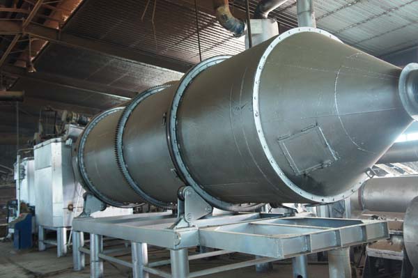 工業(yè)烘干設(shè)備屬于礦山機械,一般多為大、中型機械,其熱源來自燃燒裝置,采用順流式加熱方式。因此需要烘干的物料,從進料箱、進料溜進入筒體,即被螺旋抄板推向后。由于烘干機傾斜放置,物料一方面在重力和回轉(zhuǎn)作用下流向后端,另一方面物料被抄板反復(fù)抄起,帶至上端再不斷地揚撒下來,使物料在筒內(nèi)形成均勻的幕簾,充分與筒內(nèi)的熱氣流進行熱交換,由于物料反復(fù)揚撒,所含的水分逐漸被烘干,從而達到烘干的目的。